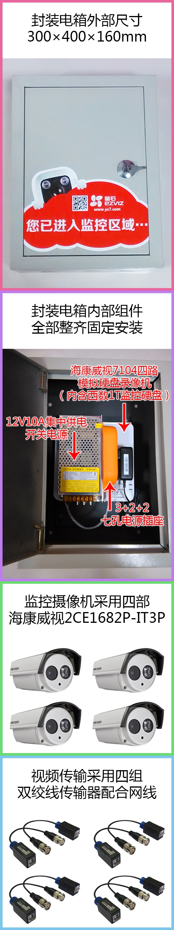 四路監(jiān)控套裝,內(nèi)含7104四路模擬硬盤錄像機一臺、西數(shù)1T監(jiān)控硬盤一塊、2V10A集中供電開關電源一個、3+2+2七孔電源插座一只、400×300×160mm電箱一個、監(jiān)控攝像機四部、雙絞線傳輸器四組、12V電源公頭四支、純銅網(wǎng)線50米及攝像機支架四支,僅售人民幣1299元,徐州市三環(huán)路以內(nèi)1799元上門包安裝,另加700元可得19寸顯示器及顯示器墻面掛架一套。